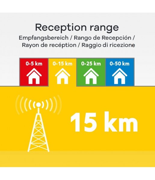 RÉCEPTION ENTRE 0 ET 15 KM : pour profiter de performances maximales, nous vous recommandons d’utiliser cette antenne dans un rayon de 15 km de l’émetteur le plus proche.