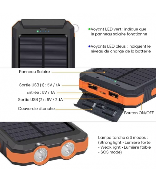 Le produit se distingue par sa robustesse et sa conception extérieure adaptée aux environnements difficiles : étanche (attention, ne pas laisser immergé pendant de longues périodes), anti-poussière et résistant aux chocs. Sa forme compacte, agrémentée d’un crochet et d’un mousqueton intégré, permet de l’accrocher facilement à votre sac, tandis que ses deux ports USB offrent la possibilité de charger simultanément plusieurs appareils. Avant utilisation, il est recommandé de recharger entièrement la batterie via une prise électrique pendant 6 à 7 heures pour activer complètement le panneau solaire.