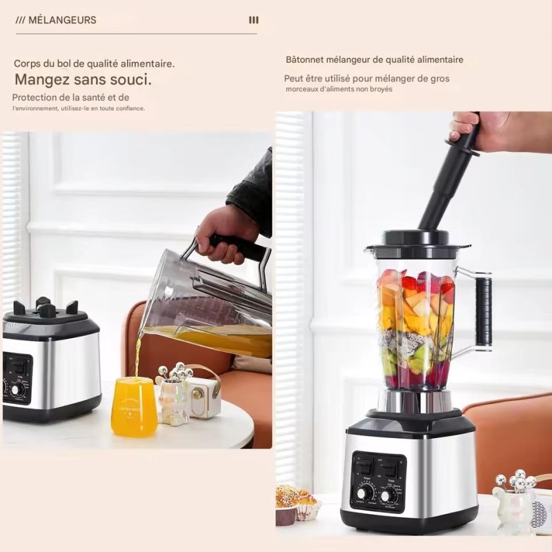Ce mélangeur fonctionne rapidement et en douceur. Il est équipé d'un puissant moteur de 9500 W et d'une lame en acier inoxydable tranchante. 38 000 rpm vous permet d'écraser facilement des glaçons, des noix et de hacher des fruits ou des légumes en quelques secondes, tout en conservant les nutriments d'origine des aliments et en préservant leur saveur. Profitez d'un mode de vie sain avec votre famille grâce à ce mélangeur professionnel.