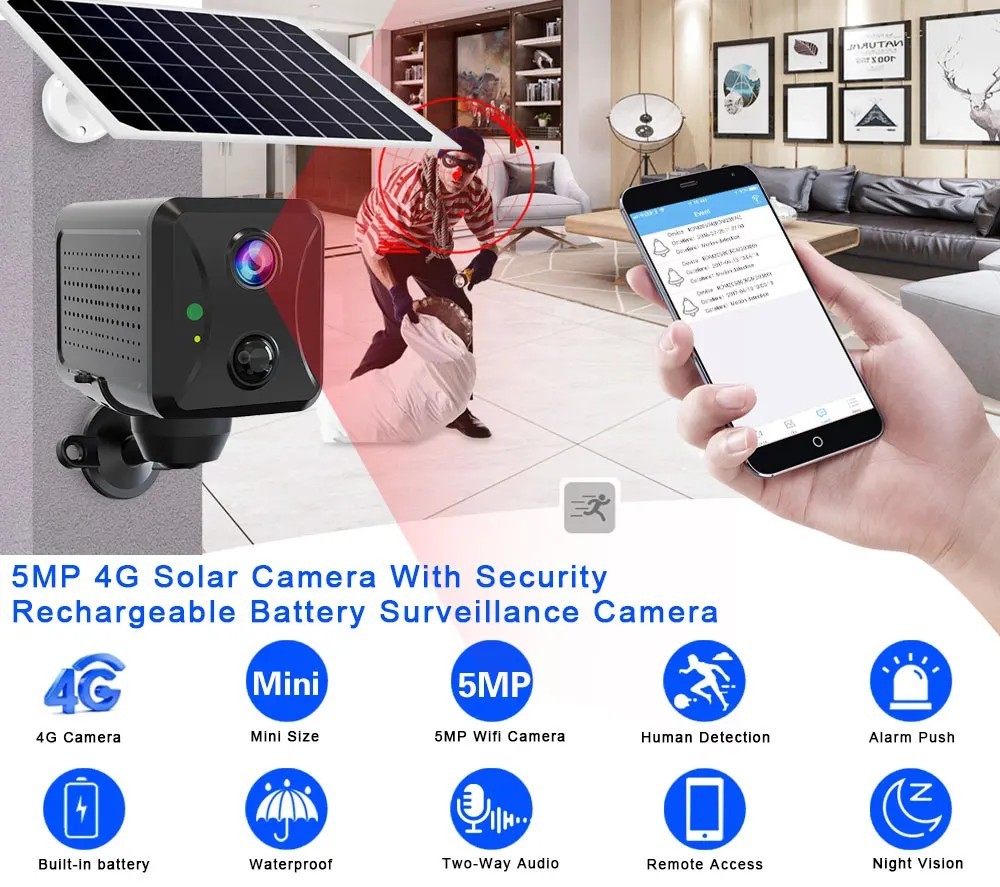 Mini caméra à panneau solaire 5MP, 100 % autonome avec connectivité 4G/Wi-Fi, détection PIR grand angle et stockage sécurisé. Idéale pour la surveillance extérieure sans fil, même en zone isolée.