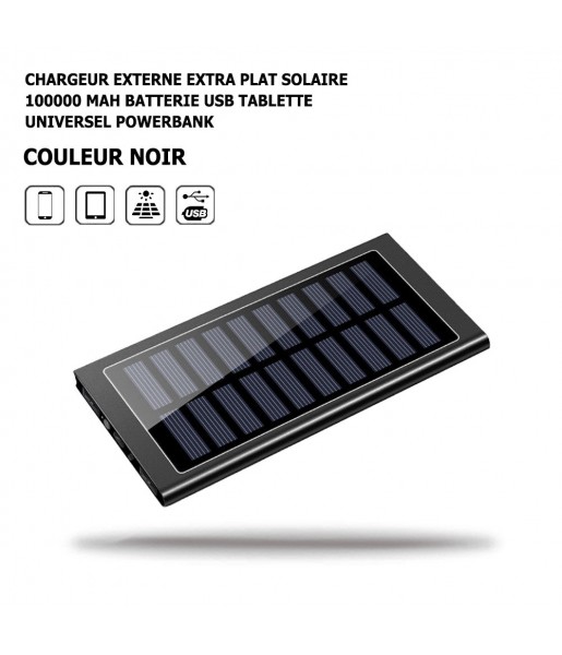 Chargeur Externe Extra Plat Solaire 100000 Mah Noir Batterie USB Tablette Powerbank, LED, Universel, Huawei, Samsung, Xiaomi Chargeur Externe Extra Plat Solaire 100000 Mah Noir Batterie USB Tablette Powerbank, LED, Universel, Huawei, Samsung, Xiaomi