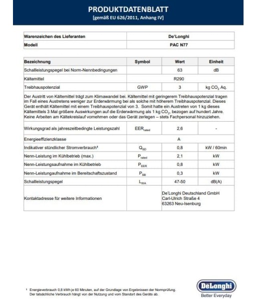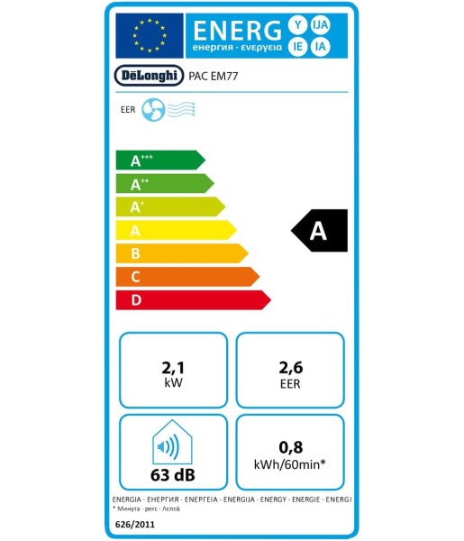 DELONGHI Climatiseur Mobile PAC EM77 – 2100W (9000 BTU) – Classe Énergétique A – Gaz R290 – 47-50 dB(A) – EER 2.6