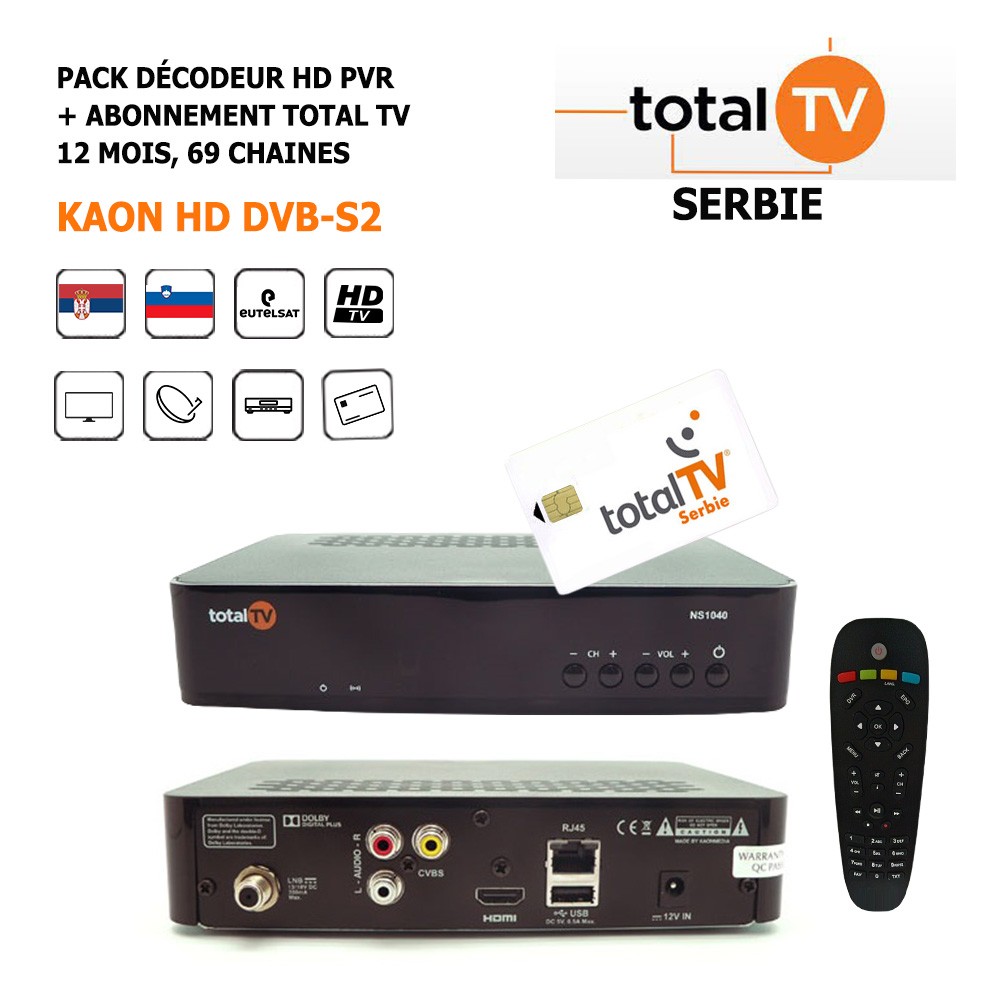 Pack Décodeur Satellite HD PVR Kaon HD DVB-S2 + Abonnement Total Tv 12 mois, 122 Chaines, Serbes, Slovènes et Serbo-Croates