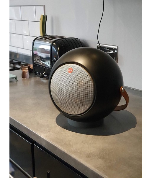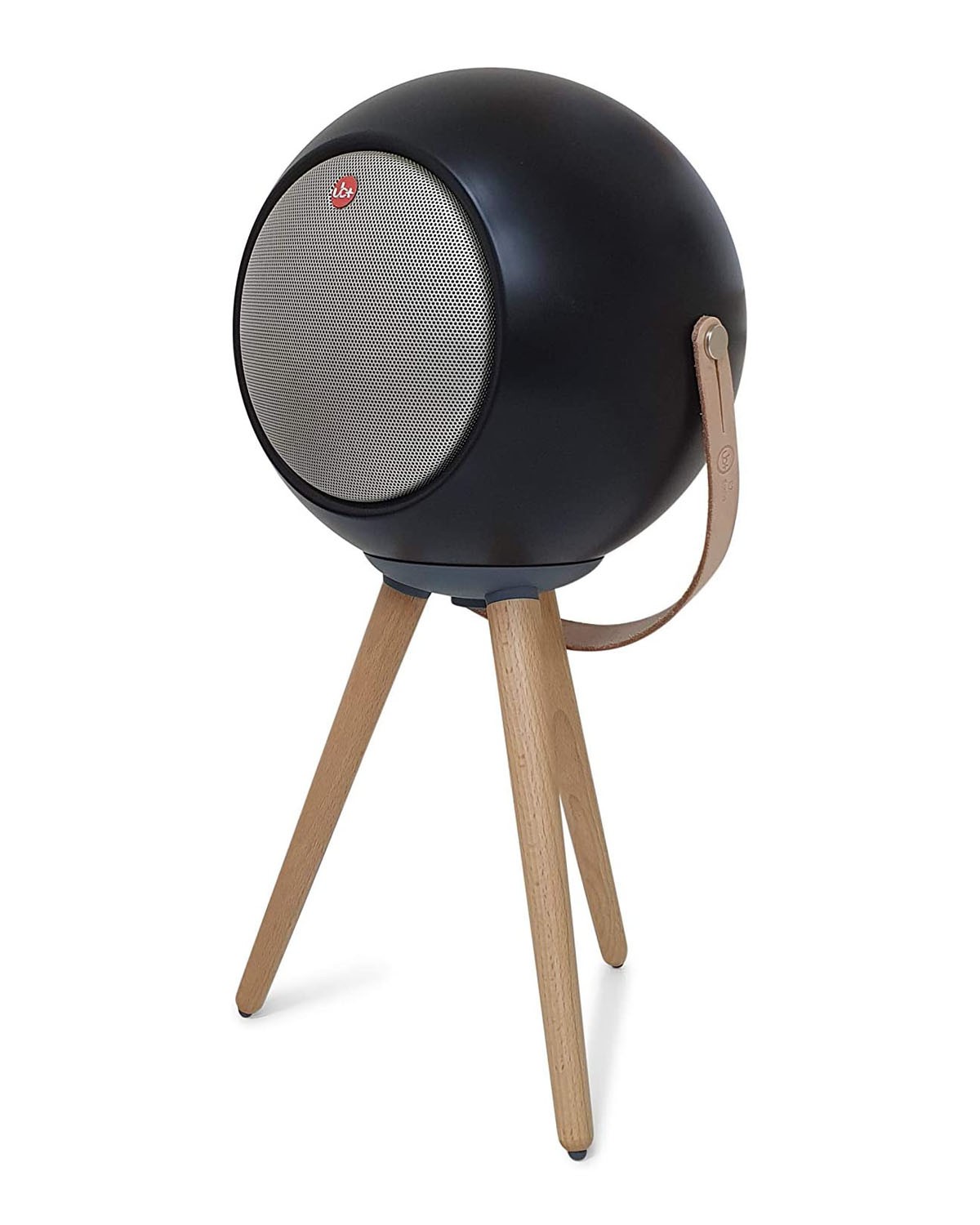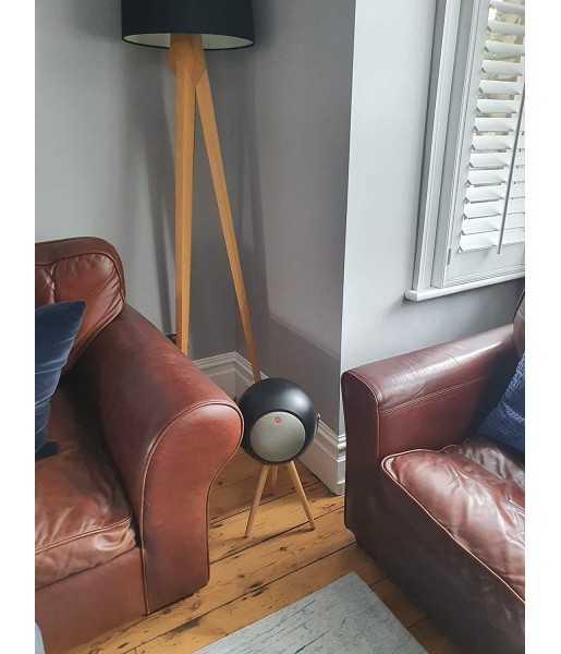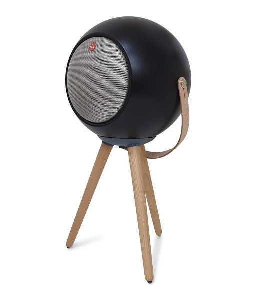 Design ergonomique et moderne : forme sphérique, trépied en bois massif et sangle en cuir incluse