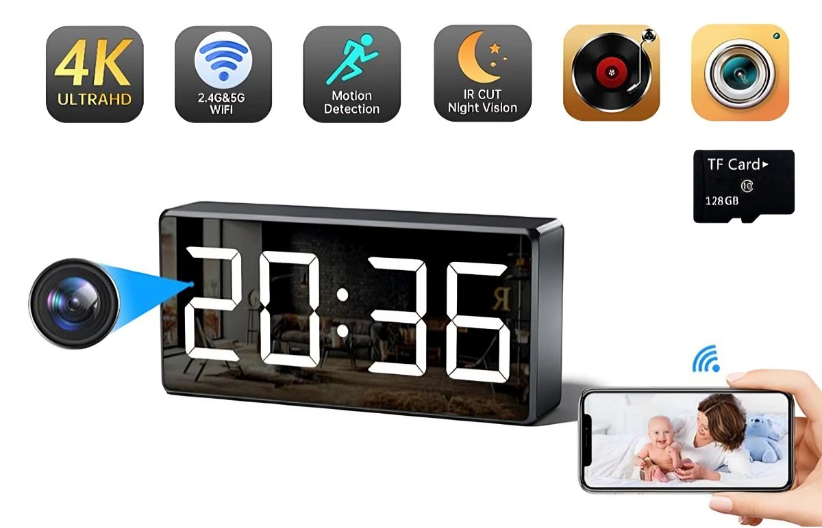 Mini caméra d'horloge de Sécurité WiFi 4K HD avec une application intelligente et détection de Mouvement + Carte micro TF SD 128