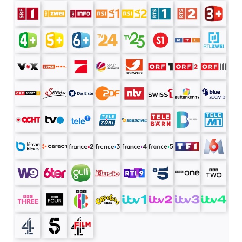 TF1, France 2, France 3, France 4, M6, RTL9, W9, Sat 1 HD, Pro Sieben, 6ter, Channel 5, TV8, BBC Four, Channel 4, ITV HD, ITV3, Das Erste, ZDF, RTS1, RTS2, Canale 5 HD, Servus, Carac 1, SRF ZWEI HD, SRF INFO HD, RSI LA1 HD, RSI LA2 HD, Kabelio 3+ à 6+, TV24, TV25, S1, RTL ZWEI, Puls Acht, ORF1 HD, ORF2 HD, Blue ZOOM D, SWISS 1, Tele ZURI HD, Südostschweiz, Kronehit TV