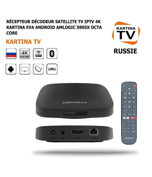 Décodeur TV IPTV 4K Kartina Eva Android, commandes vocales, Bluetooth, Amlogic S905X, ultra rapide avec garantie 2 ans. Profitez d’un divertissement illimité !
