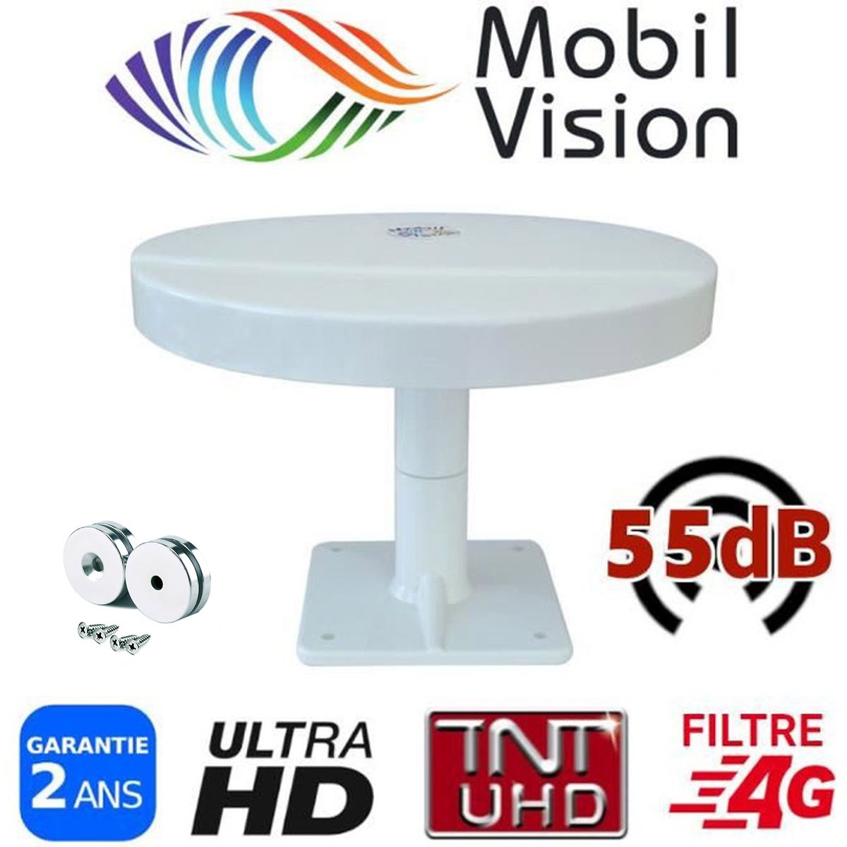 Antenne HD Omnidirectionnelle TNT Omnivision avec 4 socles magnétiques. Réception 360° en Full HD, compacte, étanche et sans amplificateur.