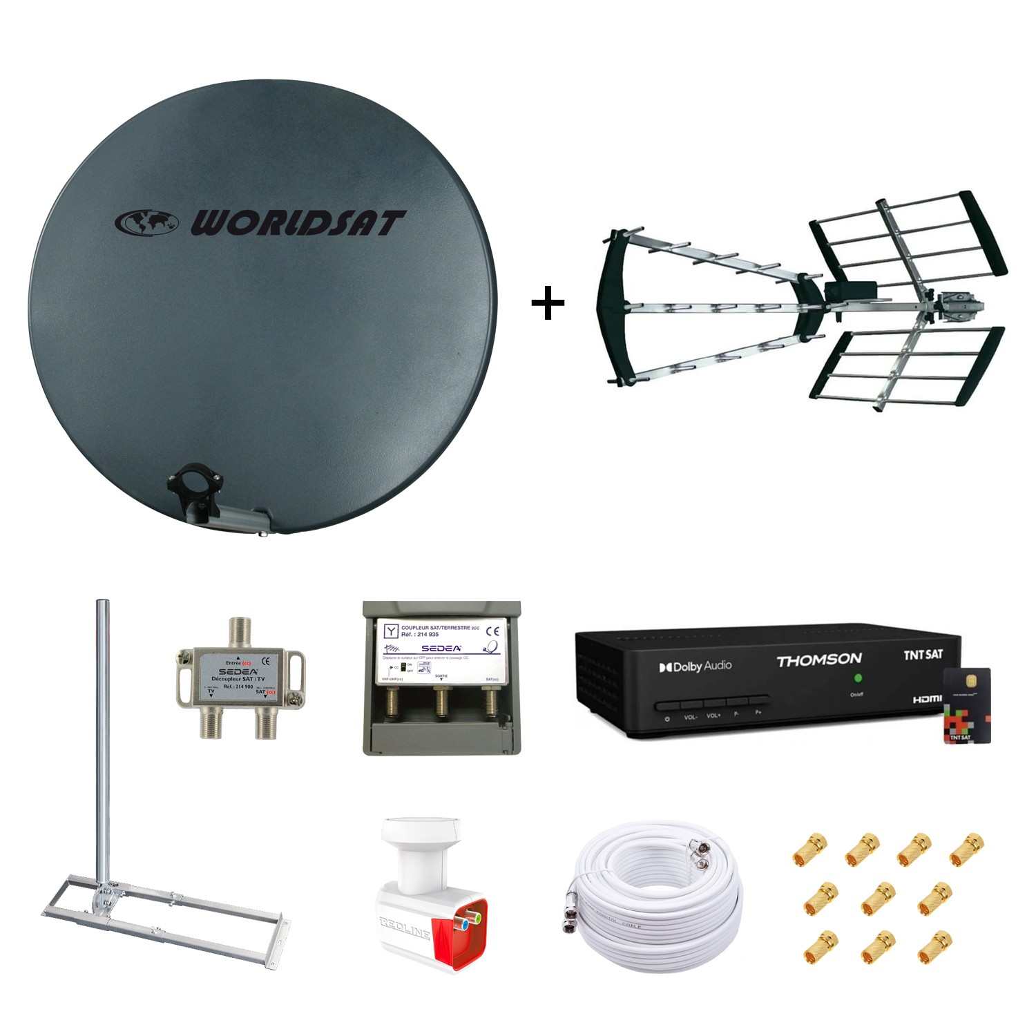 Profitez d’une réception satellite et TNT ultra-stable avec le Kit Parabole WORLDSAT 75cm en fibre SMC, complet avec décodeur, support et accessoires prêts à installer.