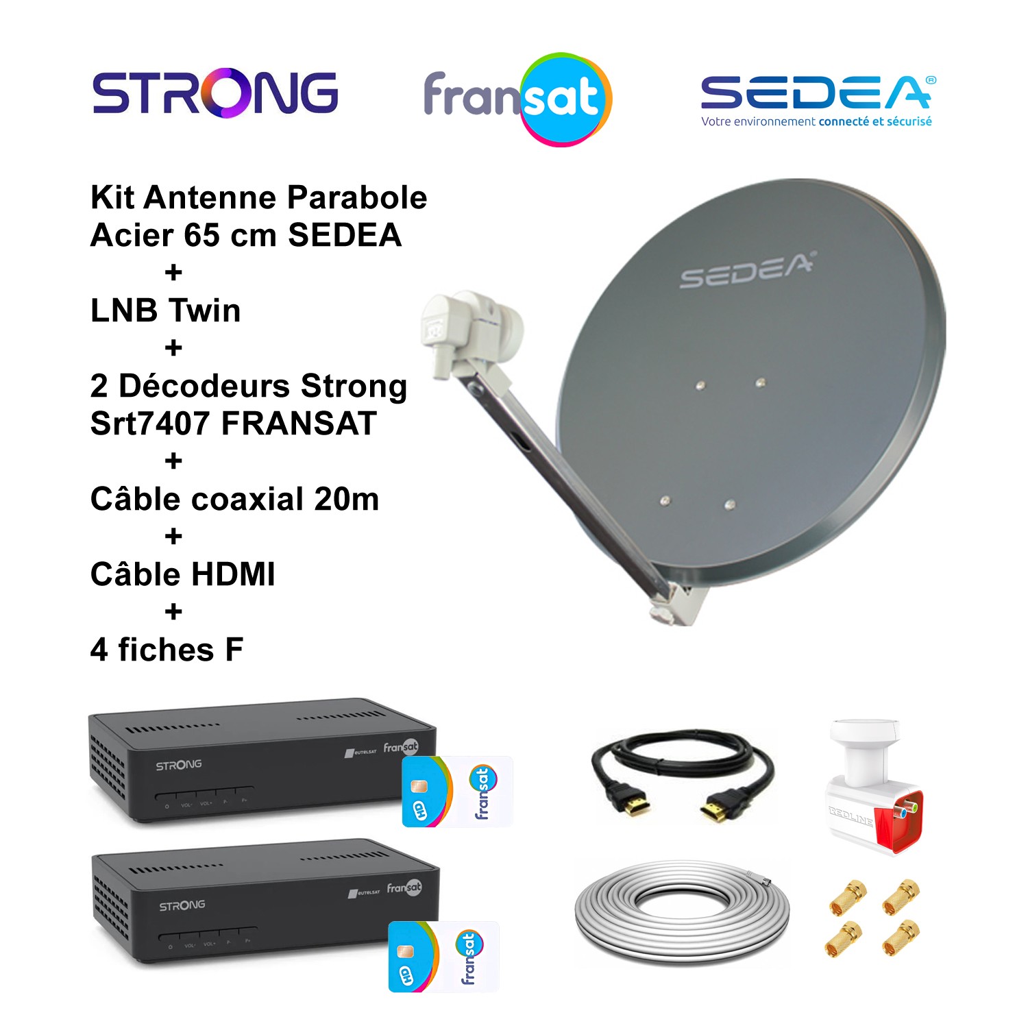 Kit Parabole Acier 65 cm Anthracite + LNB Twin 0,1 dB HD 2 Décodeurs Strong SRT 7407 Câble coaxial 20m Câble HDMI 4 fiches F