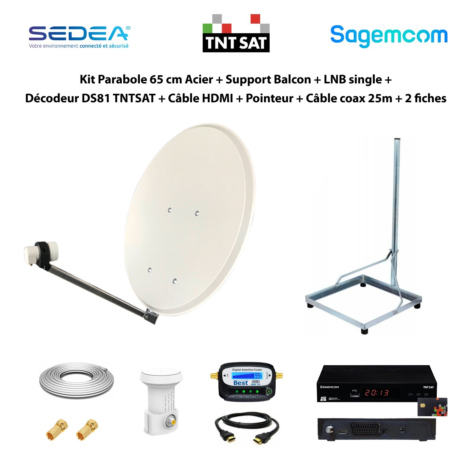 Kit Parabole 65 cm Acier + Support Balcon + LNB single + Décodeur DS81 TNTSAT + Câble HDMI + Pointeur + Câble coax 25m + 2 fiche