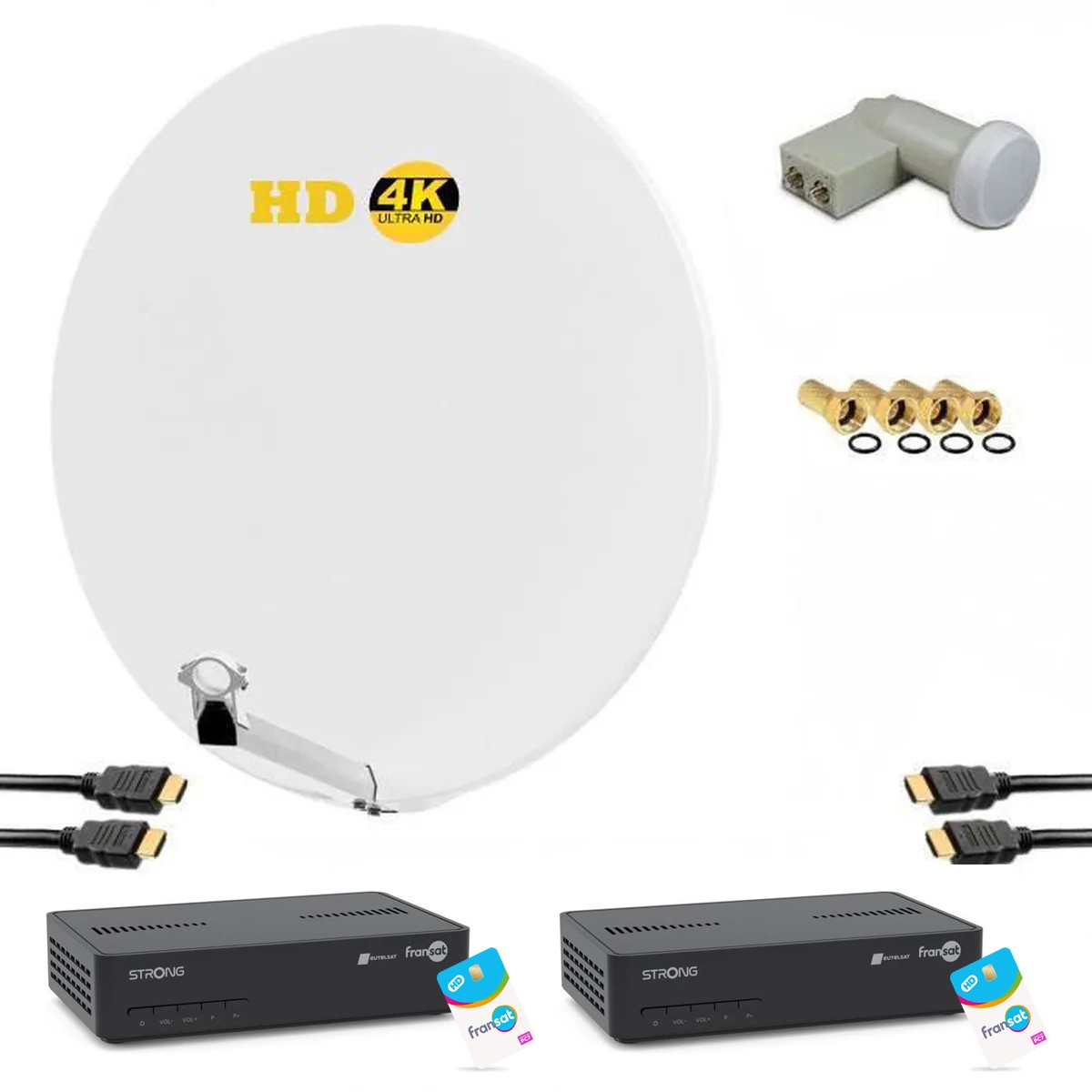 Kit complet satellite avec parabole en acier 85 cm blanche, LNB Twin 0,1 dB, 2 récepteurs TV avec carte FRANSAT incluse et 2 câbles HDMI pour une réception HD/4K performante sur deux téléviseurs.
