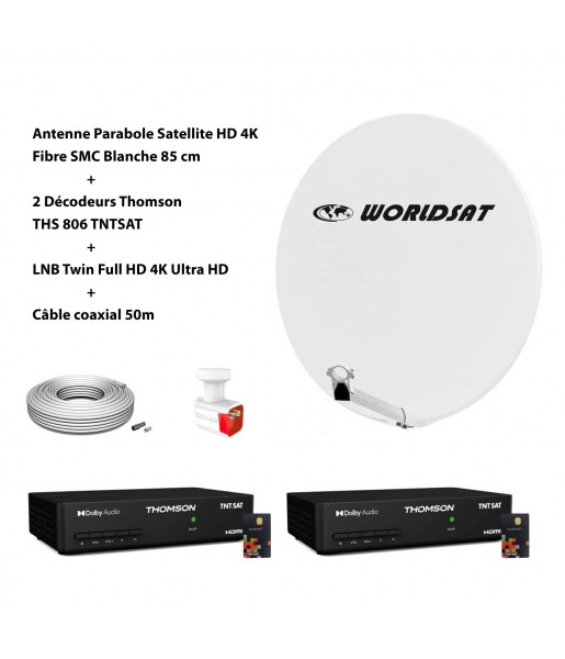 Kit Antenne Parabole Sat HD 4K Fibre SMC Blanche 85cm WORLDSAT 2 Décodeurs Thomson LNB Twin Full HD 4K Câble coaxial 50m