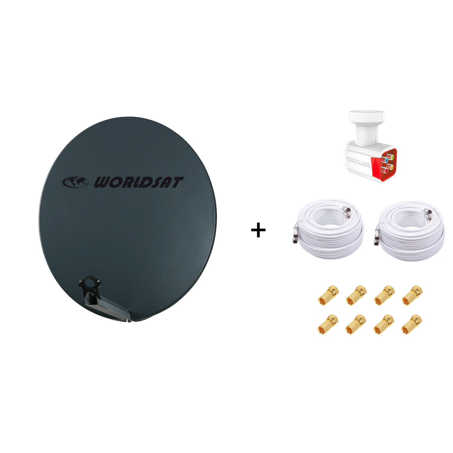 Antenne Parabole Fibre 60 cm Anthracite WORLDSAT + LNB Quad + 2 Câbles Coax 25 m