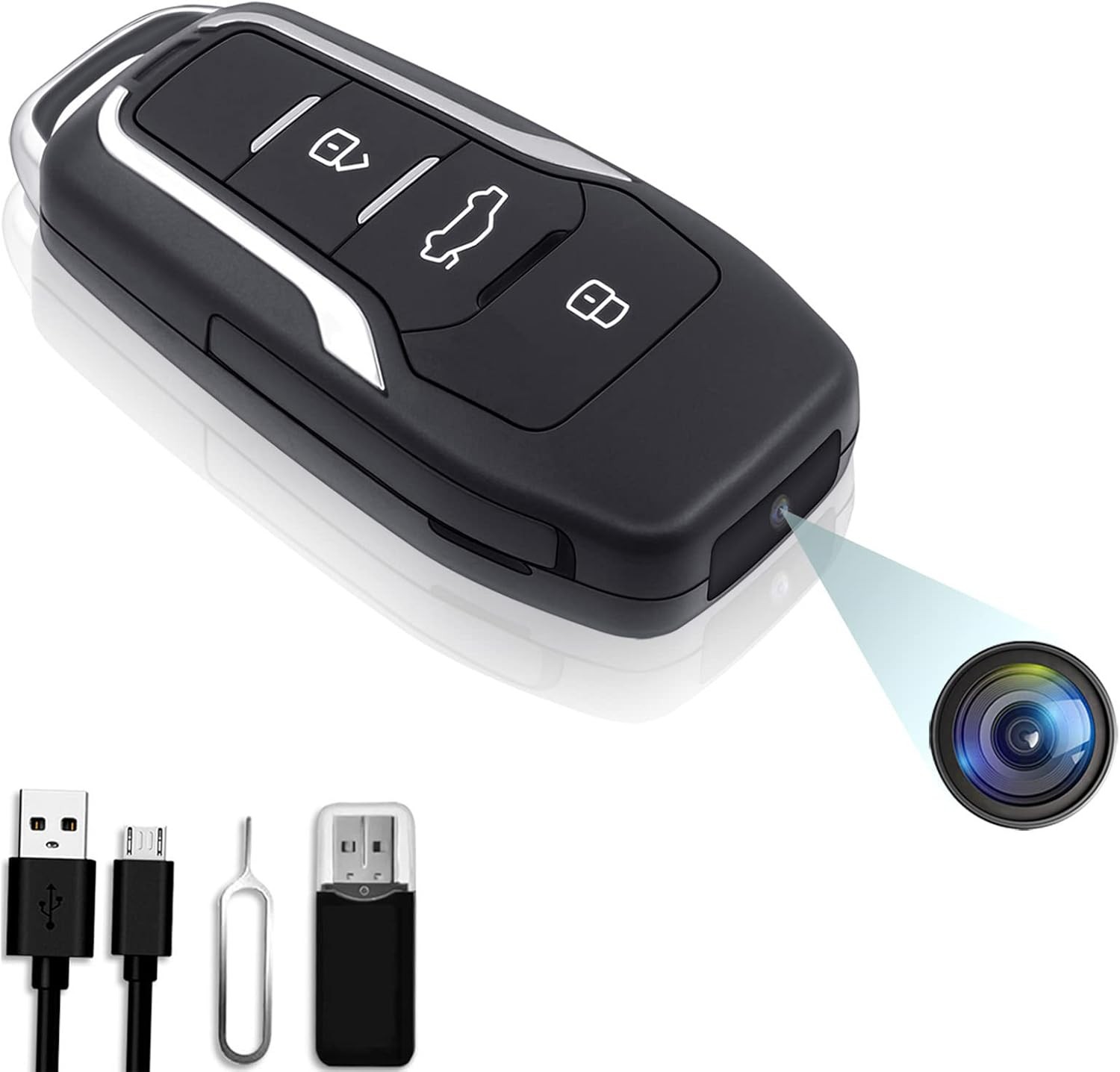 Caméra espion en forme de clé de voiture, offrant une résolution Full HD 1080P, une autonomie de 8 heures, et une mémoire intégrée de 64 Go pour une surveillance discrète et efficace.