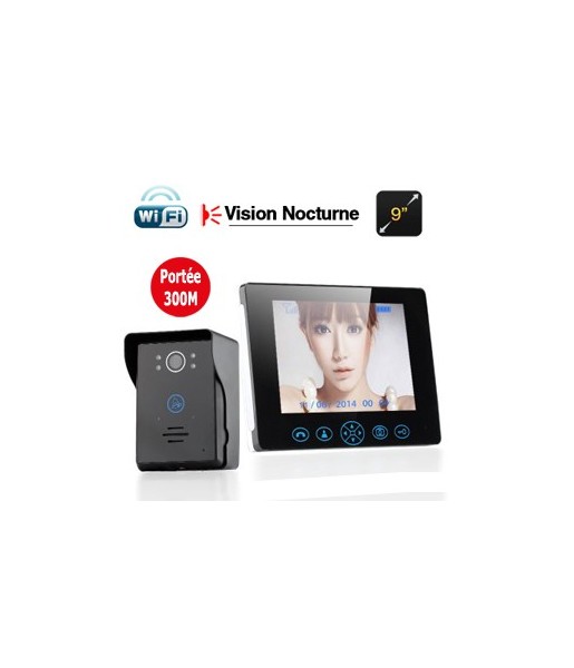Interphone audio et vidéo sans fil avec moniteur 9 pouces et caméra à vision nocturne. Surveillez vos portes jusqu’à 300 m, capturez et stockez jusqu’à 100 photos, et contrôlez l’accès à distance pour plus de sécurité et de confort au quotidien.
