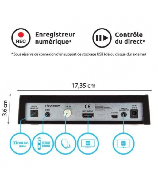 LA TNT HD SATELLITE Recevez les chaînes gratuites de la TNT HD sans abonnement ENREGISTREUR NUMÉRIQUE Enregistrez vos programmes sur vos supports USB Maitrisez le temps ! Faites pause à tout moment ou revenez en arrière pour ne plus rien manquer!