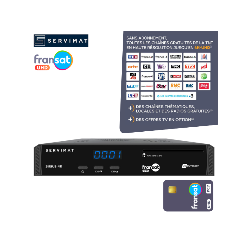 Récepteur satellite SERVIMAT SIRIUS 4K PVR Ready avec carte FRANSAT incluse. Profitez des chaînes gratuites de la TNT en 4K Ultra