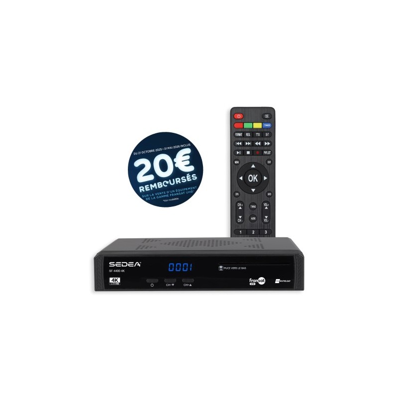 Le récepteur Sedea satellite 4K FRANSAT SF-4400 UHD est la solution idéale pour recevoir la TNT gratuite en HD et en Ultra Haute Définition par satellite, sans abonnement.