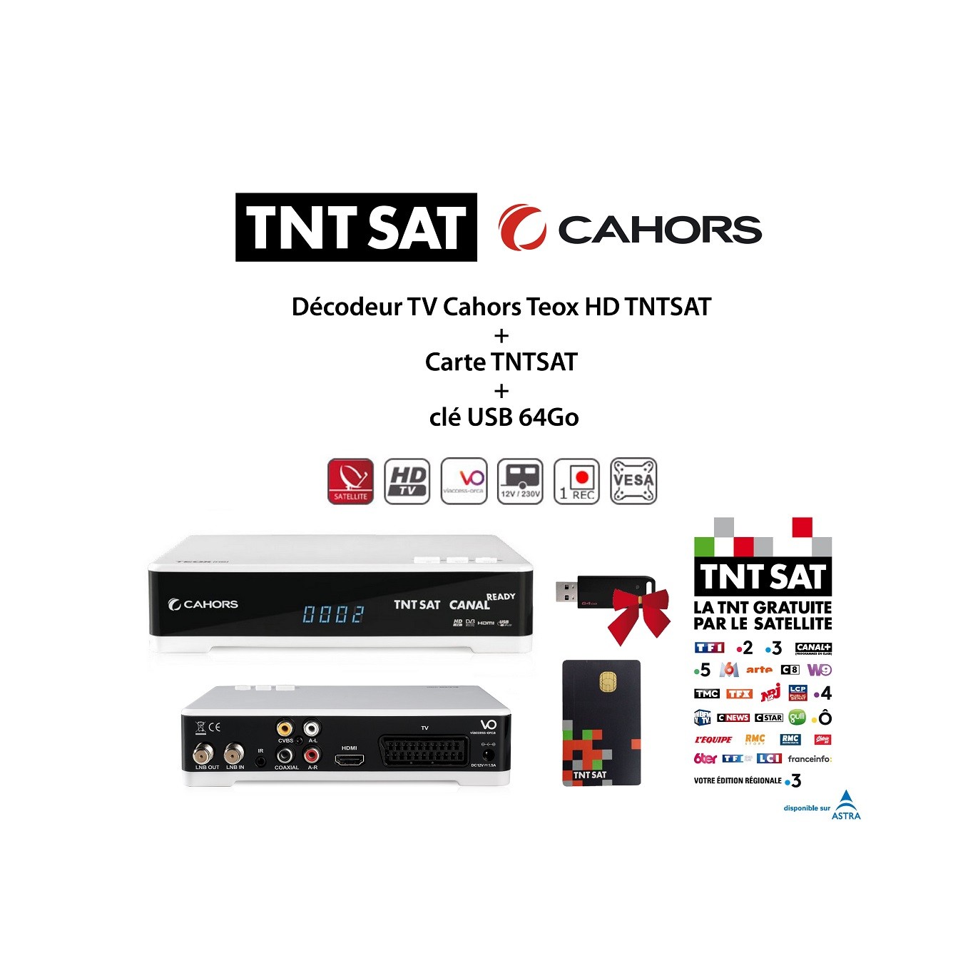 Pack Décodeur TV Cahors Teox HD TNTSAT + Carte TNTSAT + clé USB 64Go