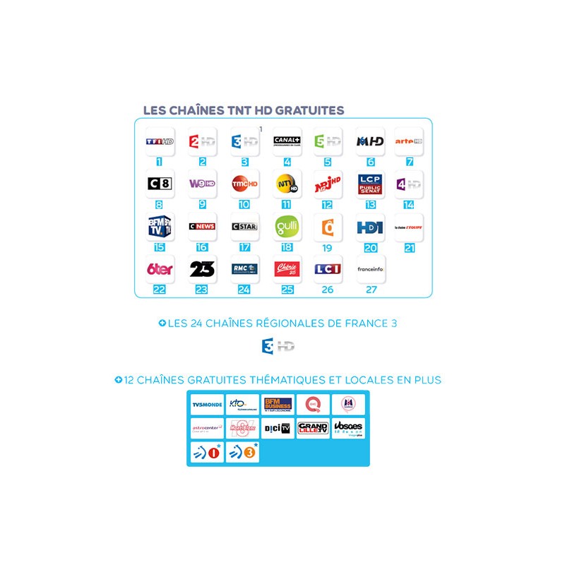 En avril 2016, 100% des chaînes seront diffusées au format MPEG4 HD. A cette date, pour continuer à recevoir vos chaînes et éviter de vous retrouver face à un écran noir, vous devrez donc être équipé d'un récepteur compatible. Equipez-vous dès à présent d'un récepteur MAYA HD Connect et soyez prêt pour le passage à la TNT HD ! Recevez gratuitement via le satellite EUTELSAT 5WA (ex ATLANTIC BIRD 3) :