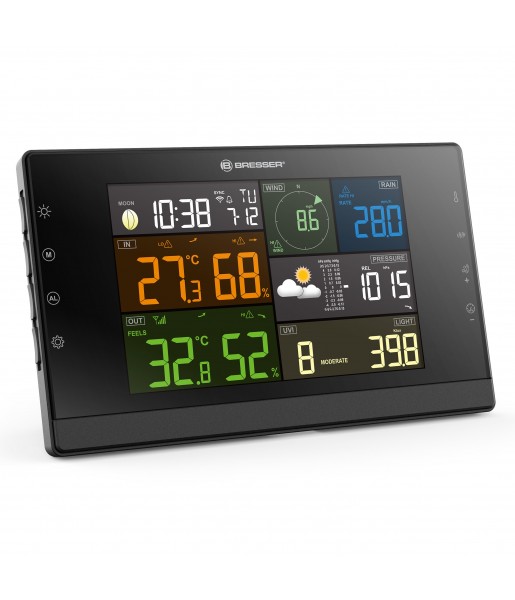 Le Centre météorologique WiFi Profi-WSC de BRESSER offre des mesures locales complètes grâce à son capteur 7 en 1 : température, humidité, vent, pluie, UV et luminosité. Son écran couleur clair et l’application WSLink facilitent la consultation et le partage des données en ligne, tandis que les alertes et tendances météo vous aident à anticiper les conditions climatiques.