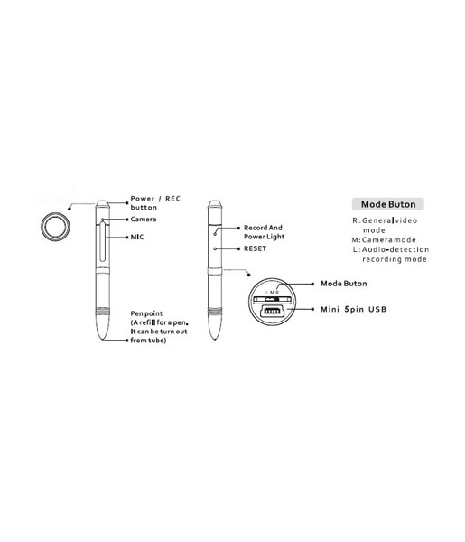 Stylo caméra espion discret enregistre vidéo couleur (600x480) et audio sur détection sonore. Mémoire interne (2/4/8Go) + MicroSD jusqu'à 32Go (option). Autonomie 2-5h. Lecture facile sur PC via USB. Design stylo compact (150x15x15mm, 30g). Fonction photo 1280x1024. Idéal surveillance discrète.